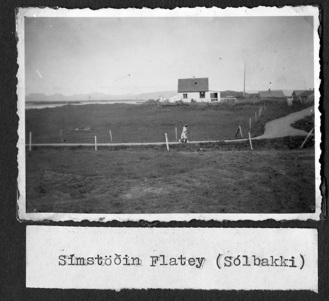 Sólbakki á sumardegi. Þvottur á snúrum og stúlkur á ferð með hrífur um öxl. Myndin er tekin áður en símstöðin hefur verið flutt í Sólbakka. Loftnetið er ekki komið upp.