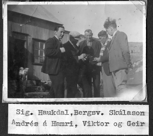 Frá vinstri talið: Sigurður Haukdal Sigurðsson (f. 07.08.1903, d. 31.07.1985) prestur í Flatey 1929-1945, Bergsveinn Skúlason rithöfundur (f. 03.04.1899, d. 21.08.1993), Andrés á Hamri (mjög líklega Andrés Gíslason bóndi á Hamri í Múlaveit á Barðaströnd f. 20.04.1888, d. 05.03.1976, sjá viðtal Tíminn Sunnudagsblað 13.10.1973), Viktor Guðnason, Geir (sennilega Geir Haukdal Sigurðsson f. 05.08.1899 d. 23.05.1980, bróðir Sigurðar ). Myndin er sérlega skemmtileg fyrir þær sakir að Bergsveinn er að skrifa eitthvað hjá sér en hann skrifaði margar bækur um þjóðhætti Breiðafjarðareyja.