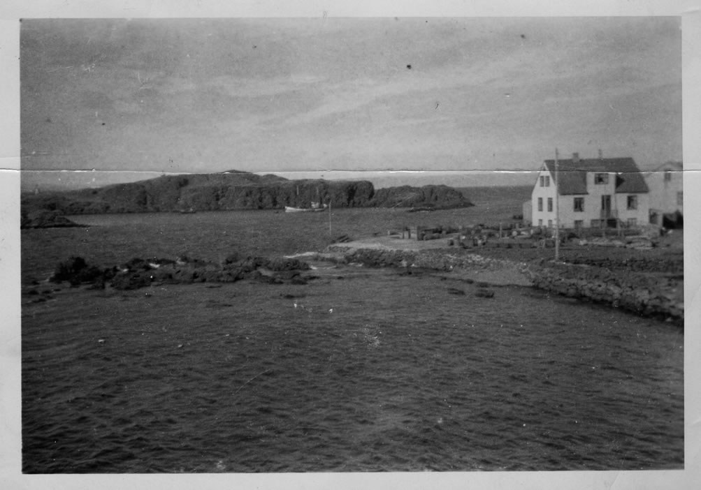 Háflóð í Flatey. Hafnarey. Mb. Konráð á legunni.